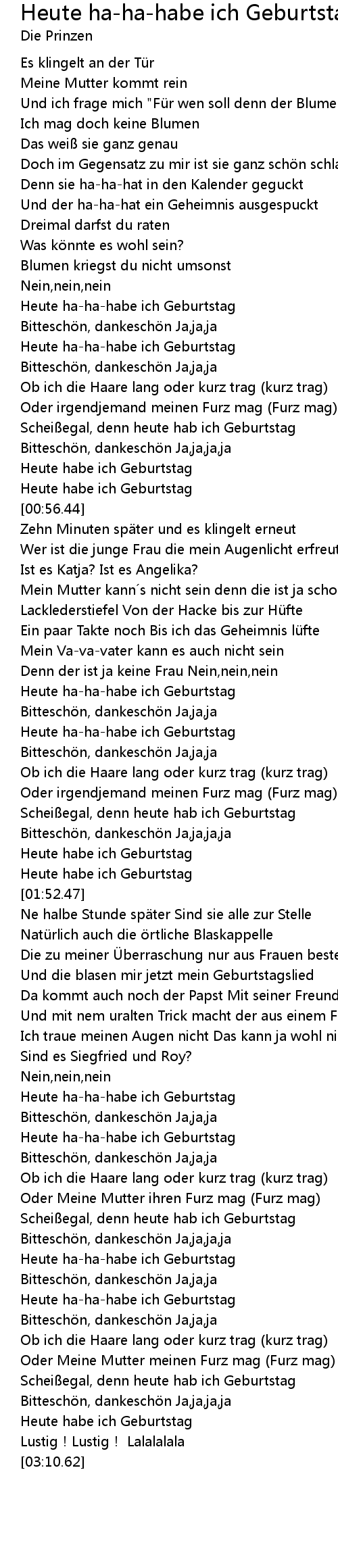 Heute ist geburtstag lyrics. Ich würd mich freuen über einen anruf. Dodge city freut sich auf den ersten mai denn alle fühl n sie da unendlich frei schon morgens sitzt der sheriff im büro die stiefel auf dem tisch. Heute ist geburtstag ich hab alles vorbereitet habe dosenbier gekauft und auf dem teppich ausgebreitet bunte kerzen aufgestellt und ein bisschen was zu essen nur der kuchen ist noch im laden den hab ich leider dort vergessen punkt acht uhr kommen die gäste ich habe alle eingeladen zum hauptmenu gibt es die reste von den letzten 5 6 tagen. Heute ist nicht dein tag denn heute ist mein tag deine freundin ist bei mir und küsst mein n arsch denn sie hängt an miesen wichsern so wie hitlers bart is nicht wahr.